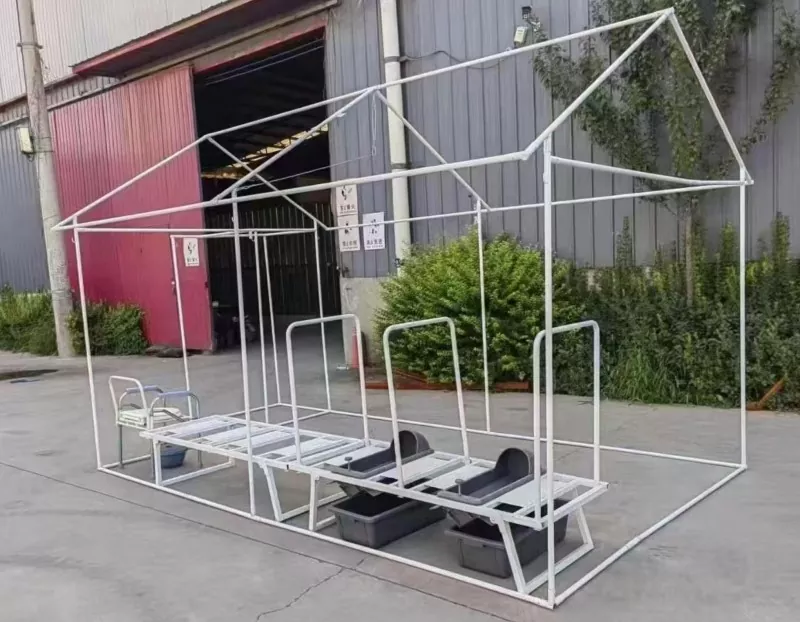 အရေးပေါ် သဘာဝဘေး ကယ်ဆယ်ရေး အိမ်သာတဲတွင် လျှောစောက်နှစ်ထပ် ဒေါင်လိုက် နံရံဖွဲ့စည်းပုံ ပါရှိသည်။ သံမဏိဘောင်သည် သံချေးမတက်အောင် ကုသမှုခံယူပြီး ကာဗာကို ရေစိုခံကာ မီးမလောင်စေသောပစ္စည်းများကို အသုံးပြုကာ သန့်ရှင်းရေးပစ္စည်းများကို မှိုဖွဲ့စည်းခြင်းဖြင့် တိကျသောအတိုင်းအတာဖြင့် ပြုလုပ်ထားသည့် သန့်ရှင်းရေးပစ္စည်းများဖြစ်သည်။ အာရုံခံအလင်းရောင်စနစ်သည် ရေစိုခံခြင်းနှင့် တုန်လှုပ်မှုဒဏ်ခံခြင်းဆိုင်ရာ စမ်းသပ်မှုများကို ကျော်ဖြတ်ပြီး ပြင်ပအသုံးပြုမှုအတွက် သင့်လျော်သည်။ မော်ဂျူလာ ဒီဇိုင်းအယူအဆကို ကျင့်သုံးခြင်းဖြင့် တဲသည် လျင်မြန်စွာ စုဝေးနိုင်ပြီး တပ်ဆင်မှုကို ဖယ်ရှားနိုင်သည်—သံမဏိဘောင်ချိတ်ဆက်မှုများသည် ကိရိယာမပါဘဲ စနစ်ထည့်သွင်းမှုကို ခွင့်ပြုသည့် snap-on အဆစ်များကို အသုံးပြုသည်။ လေဝင်လေထွက်စနစ်သည် အတွင်းပိုင်းလေလည်ပတ်မှုကို ထိန်းသိမ်းရန် အင်းဆက်ပိုးမွှားဒဏ်ခံစခရင်များပါရှိသော convection ဒီဇိုင်းကို လက်ခံပါသည်။
